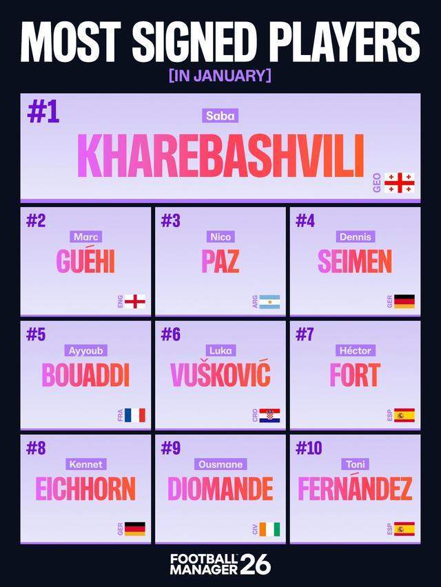 马克-格伊、尼科-帕斯、迪奥曼德、阿尤布-布阿迪……看到这些名字还算正常。然而,在热门游戏《足球经理》1月份全球最常被签下的十名球员中,有一个排名第一的名字格外引人注目,因为几乎无人知晓他是谁——:萨巴-哈列巴什维利(第比利斯,2008年9月3日出生)。